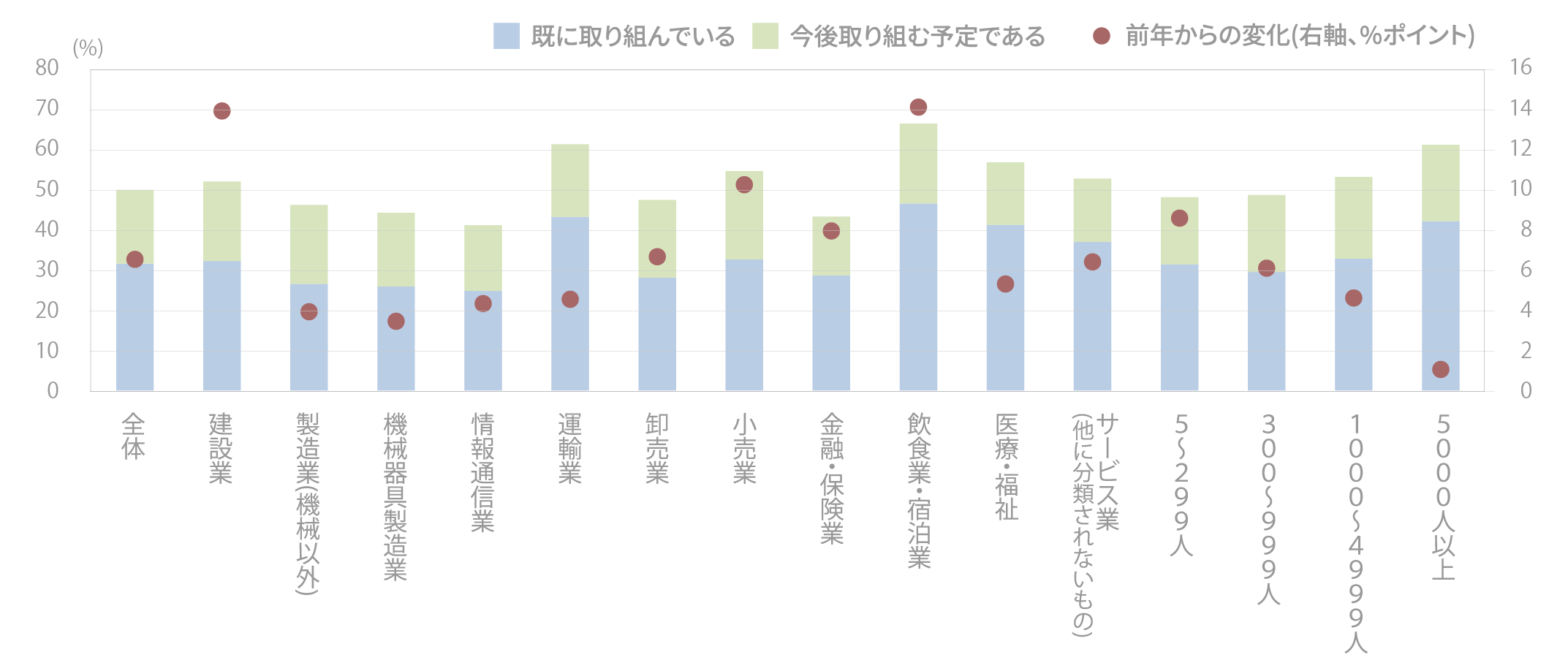 従業員規模についても、大手・中小問わず取り組みは積極的に進んでおり、特に中小企業の伸び率が高い。