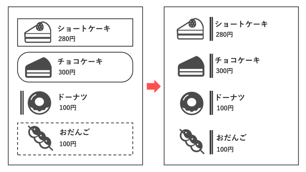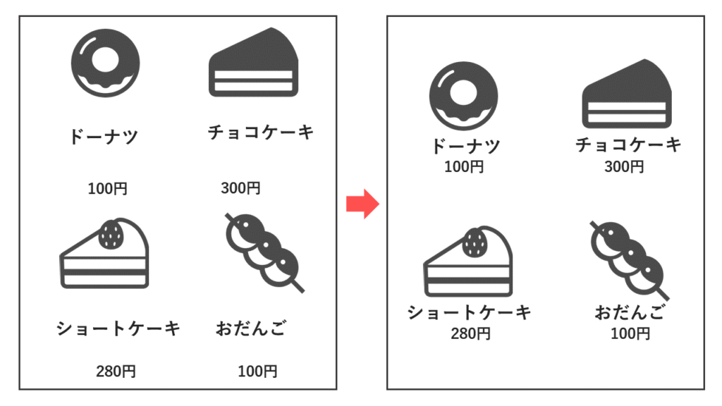 左の状態だと、ドーナツとショートケーキ、どちらが100円なのかパッと見て判別しづらいですよね。