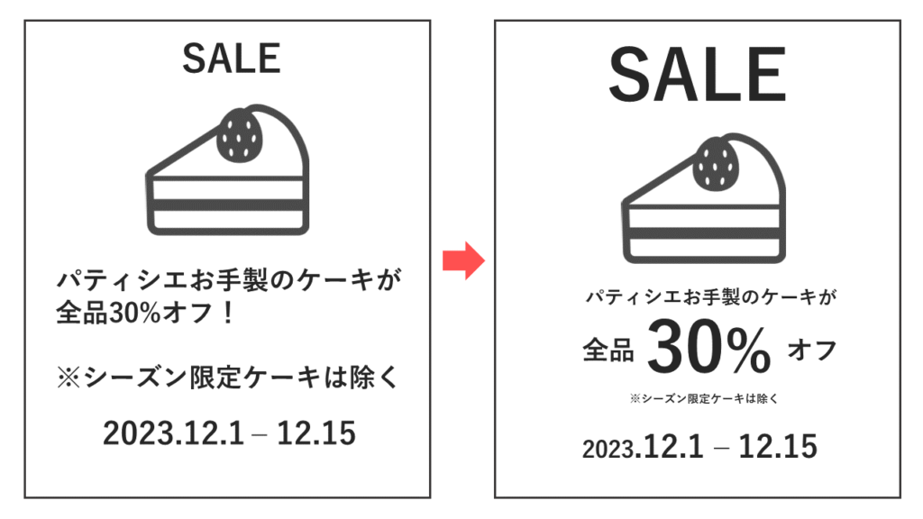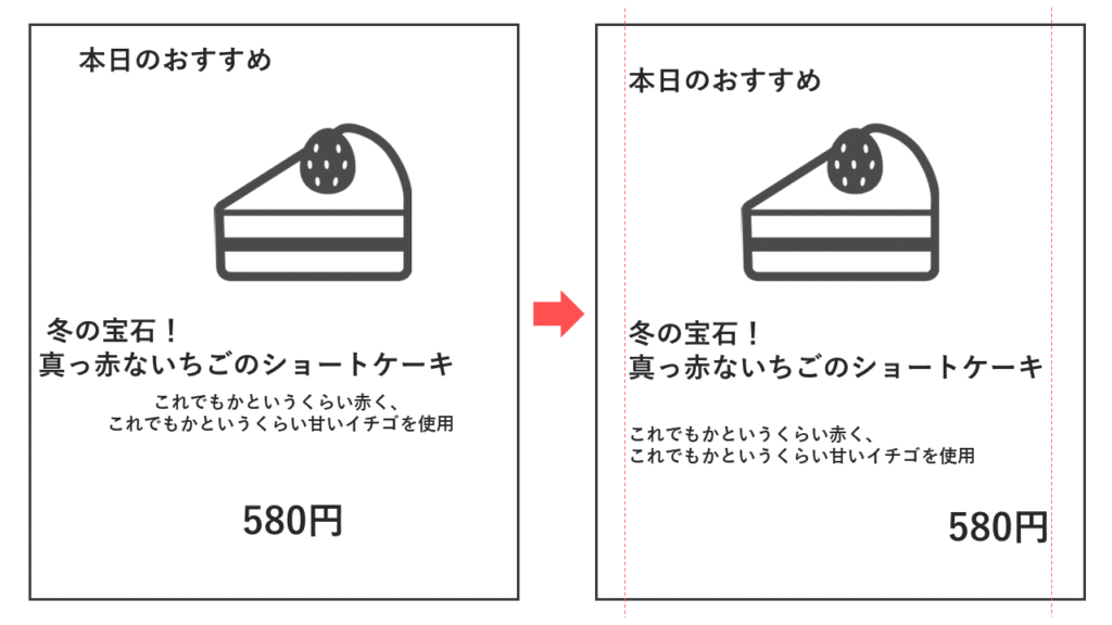 左図は商品ごとのあしらいが統一されていませんが、右図のように統一することで、一貫性があるデザインになります。