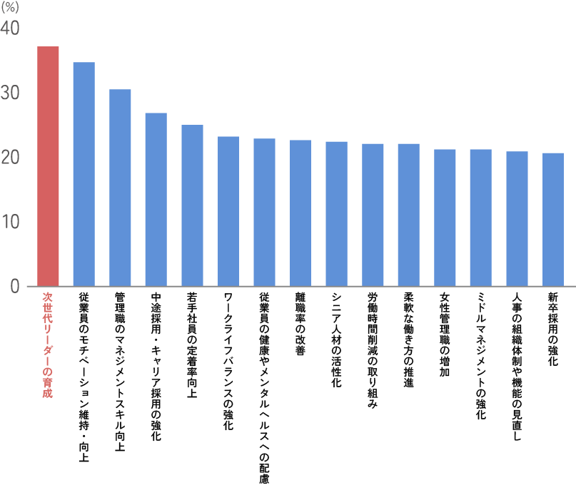 人事の課題は新卒採用と中途採用という相変わらずのものだが、注目して欲しいのは一番左側の「次世代リーダーの育成」だ。