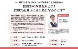 9/4(水)人事担当者向けセミナー&学生等による座談会 就活生の本音を知ろう!就職先を選ぶときに気になることは?