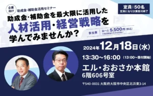 2024年12月18日(水)開催。助成金・補助金の活用法と持続可能な人事戦略を学ぶセミナー。第1部では経営に役立つ助成金・補助金の紹介と申請のポイントを解説。第2部では多様な人材活用を重視し、採用から育成までの持続可能な人事戦略を考えます。