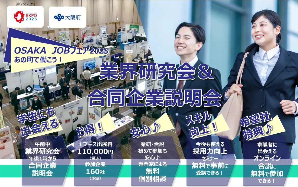 “就活が本格化する前の学生から今すぐ働きたい方が大集合”約160社が集う大規模業界研究会&合同企業説明会!!大阪府が主催する業界研究会&合同企業説明会「OSAKA JOBフェア」が今年も開催決定!例年2月に開催し、大規模就活イベントとして定