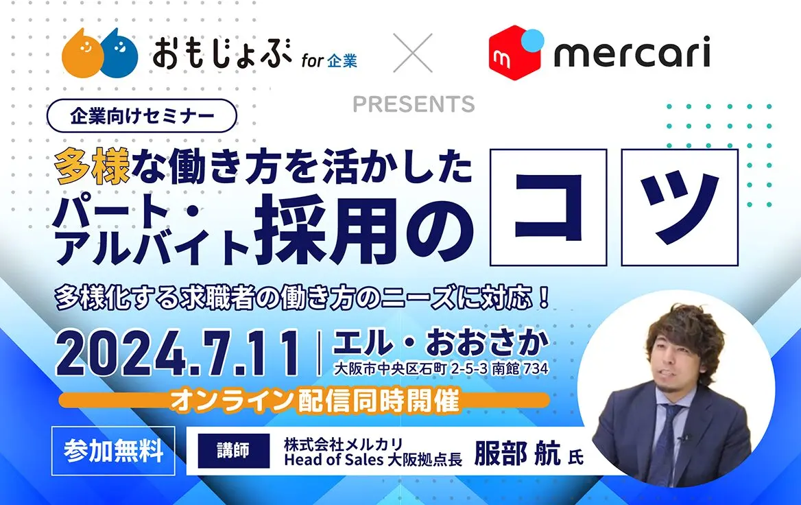 メルカリ×おもじょぶセミナー『多様な働き方を活かしたパート・アルバイト採用のコツ』2024/7/11(木)14:00 オンライン配信同時開催!