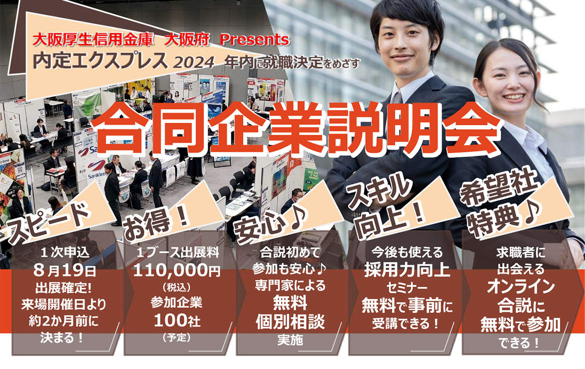 【募集受付終了】大阪厚生信用金庫・大阪府 Presents 大規模合同企業説明会『内定エクスプレス2024』 10/16(水)10:00-16:00 ハービスOSAKA