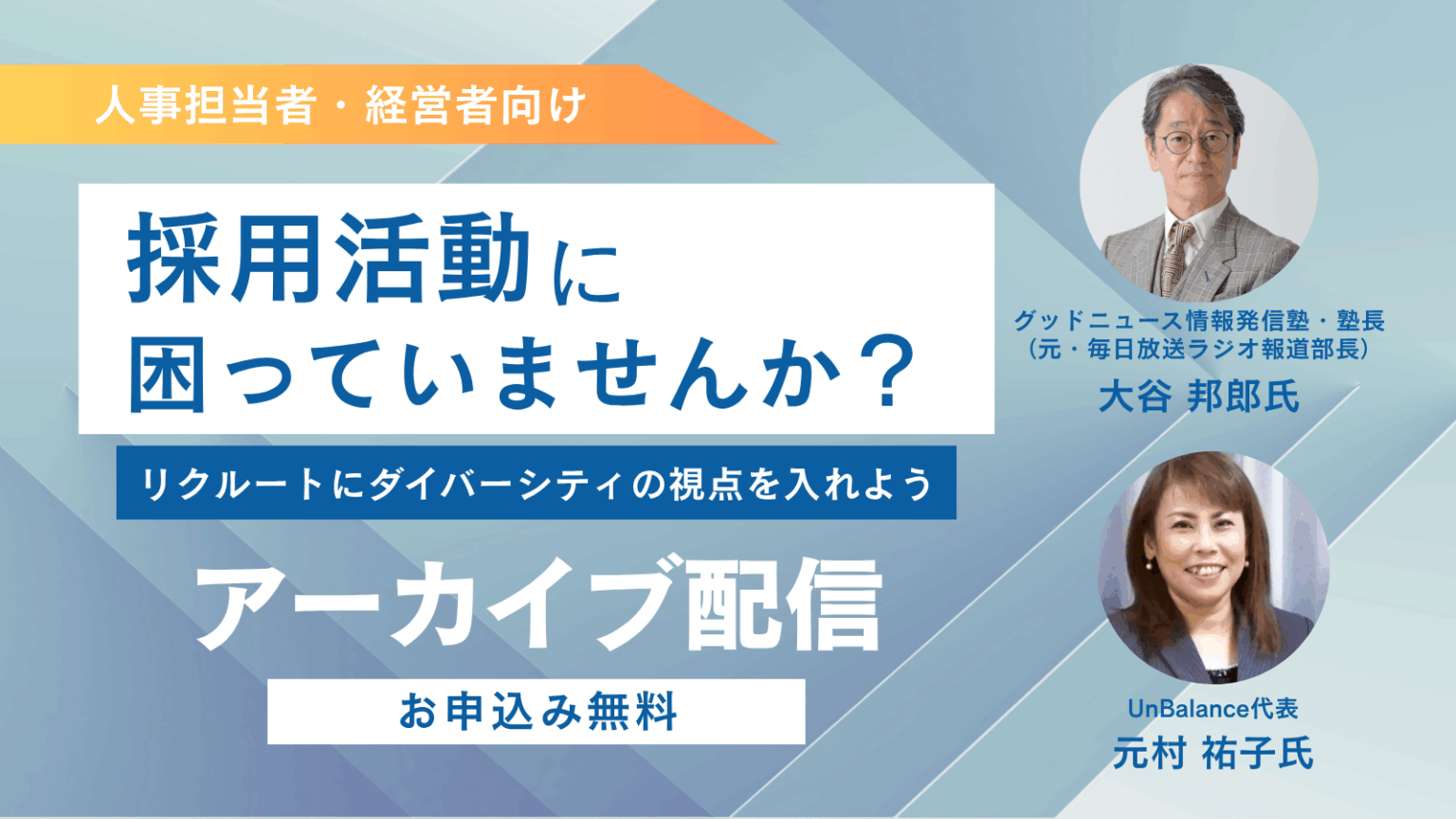 新卒採用をはじめとする採用活動にお困りの企業担当者向けのセミナーのアーカイブ動画です。ダイバーシティの視点を取り入れ、今後の採用活動を再考してみませんか?