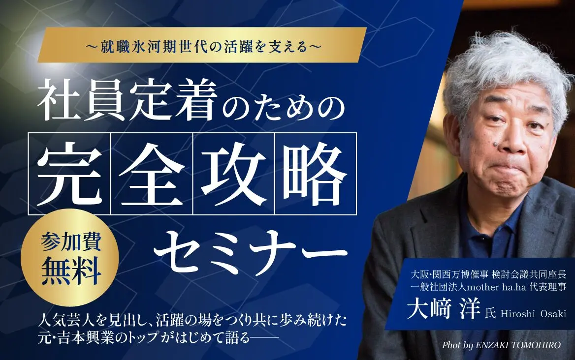 人気芸人を見出し、活躍の場をつくり共に歩み続けた元・吉本興業のトップがはじめて語る就職氷河期世代の活かし方!採用難が続く中、就職氷河期世代の社会人経験やスキルが注目されています。彼らの力を引き出すには、適切な環境整備が不可欠です。このセミナ